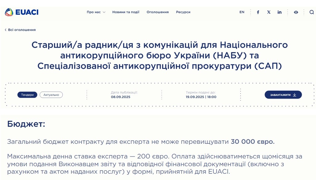Антикорупційна ініціатива ЄС в Україні (EUACI) оголосила конкурс на старшого радника з комунікацій для Національного антикорупційного бюро (НАБУ) та Спеціалізованої антикорупційної прокуратури (САП). За пів року контракту експерту готові заплатити до 30 тис. євро (до 5 тис. євро на місяць). Про це повідомляє «Главком» з посиланням на сайт EUACI.
