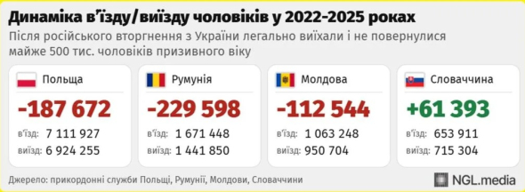 За даними польської Straż Graniczna, після початку повномасштабної війни до Польщі виїхали та не повернулися близько 188 тис. українських чоловіків. У Румунії та Молдові загальна кількість перетинів кордону менша, але різниця між в’їздами й виїздами становить 10,6% і 13,7% відповідно. Сукупне від’ємне сальдо міграції через ці дві країни перевищує 342 тис. чоловіків.
