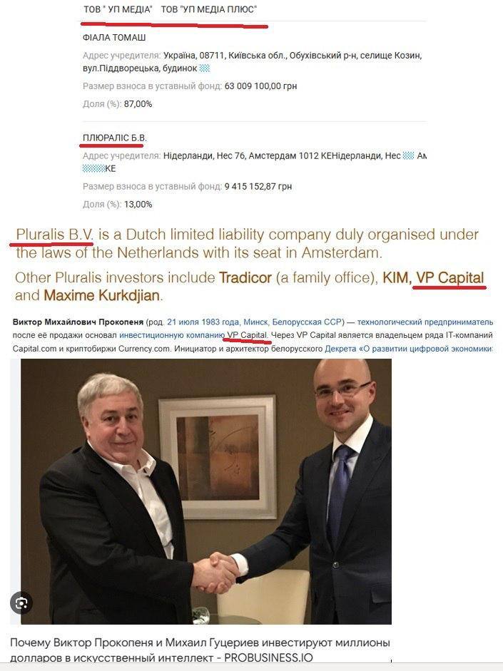 “Російський олігарх Гуцерієв — співвласник Укрправди. 31 січня власником 13% у ТОВ “УП МЕДІА ПЛЮС” та “УП МЕДІА” стала фірма Pluralis BV, офіційний інвестор якої компанія VP Capital (Лондон), власник якої білоруський мультимільйонер Віктор Михайлович Прокопеня (1983 р.н. Мінськ). Старшим партнером Прокопені є Саїд Гуцерієв (1988), син російського мільярдера Мікаїла Гуцерієва (БІНбанк, Руснафта, Ельдорадо), друг Лукашенка”, — зазначив він.